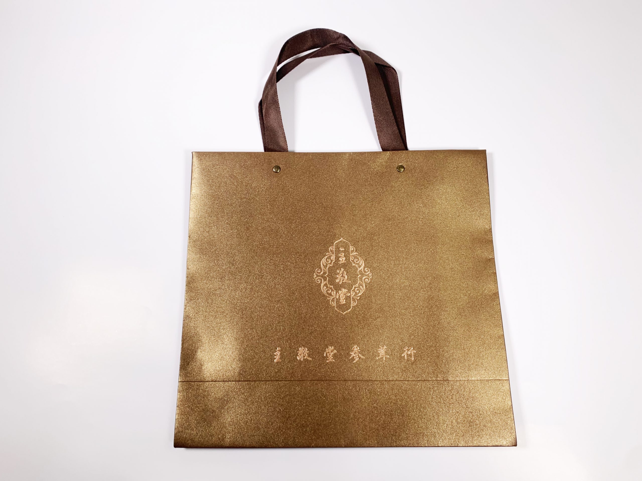 案例名称:主敬堂手提袋 类型:手提袋 材质:250g特种纸+烫金